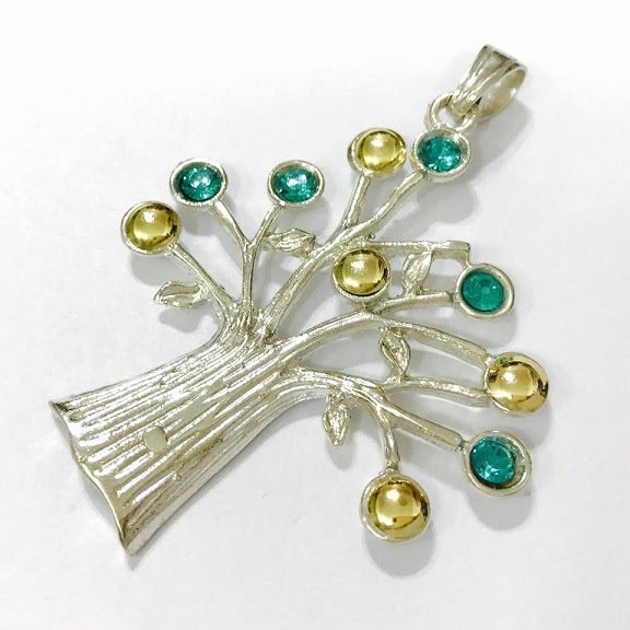 Dije Arbol de la vida con piedras color Agua marina 64mm Plata y Oro