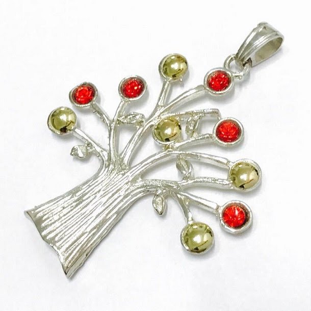 Dije arbol de la vida con piedras color rubi 64mm de Plata y Oro