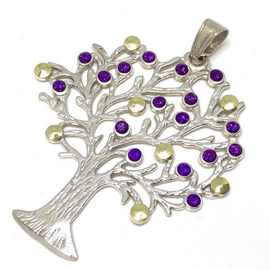 Dije arbol de la vida con piedras color amatista 70mm Plata y oro