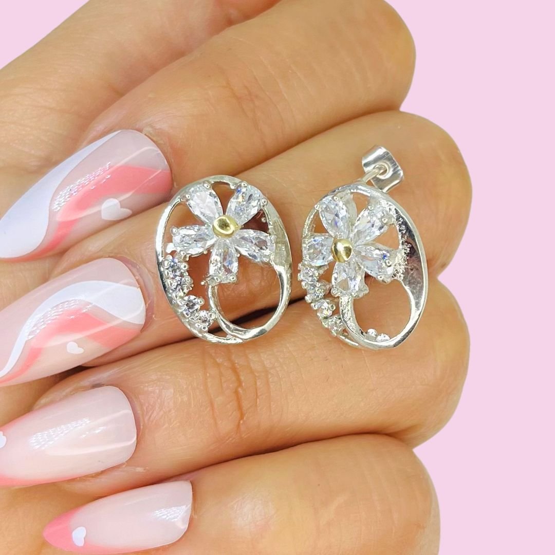 Aros Lujo flor con cubic Blanco Plata y Oro