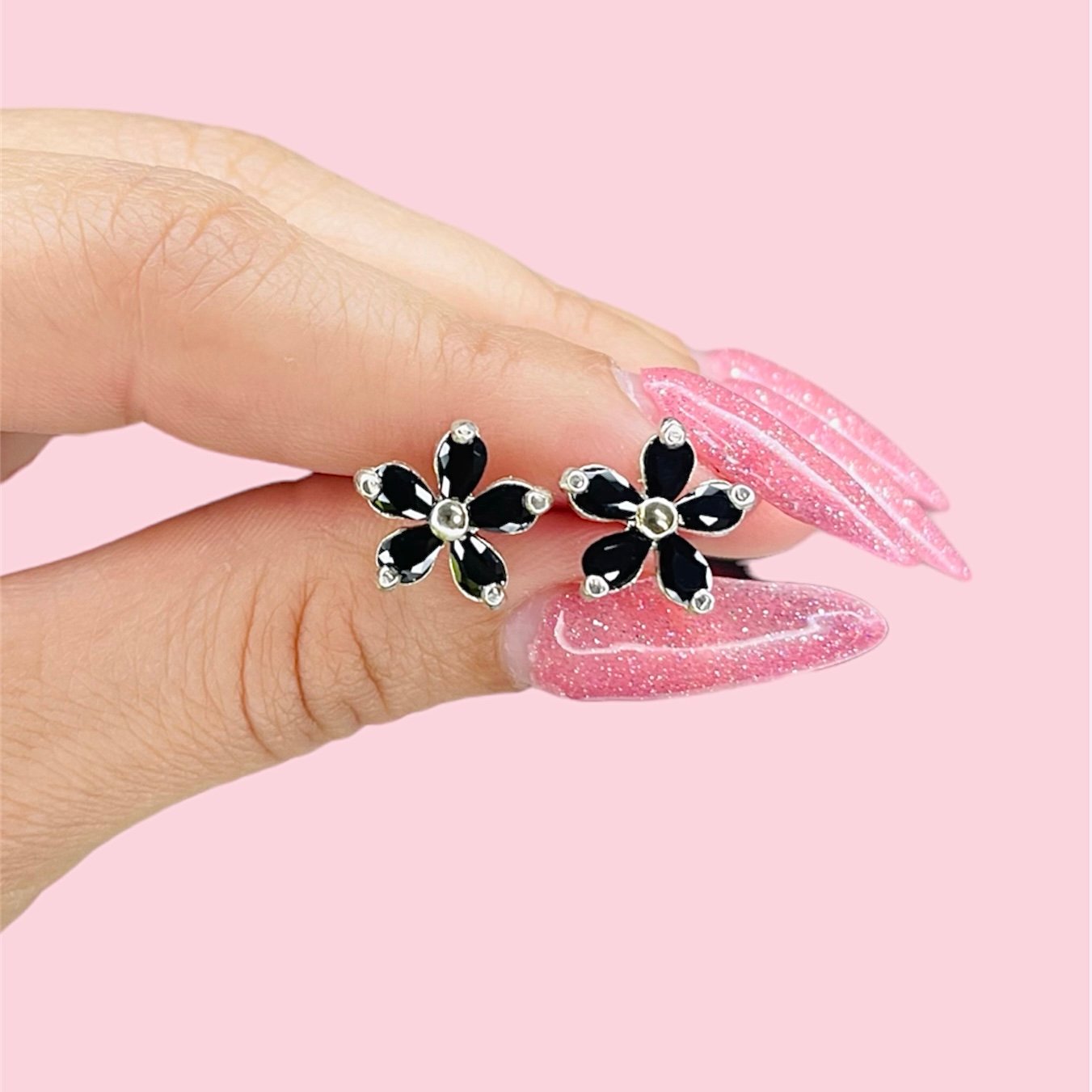 Aros flor Margarita con cubic negro Plata y Oro