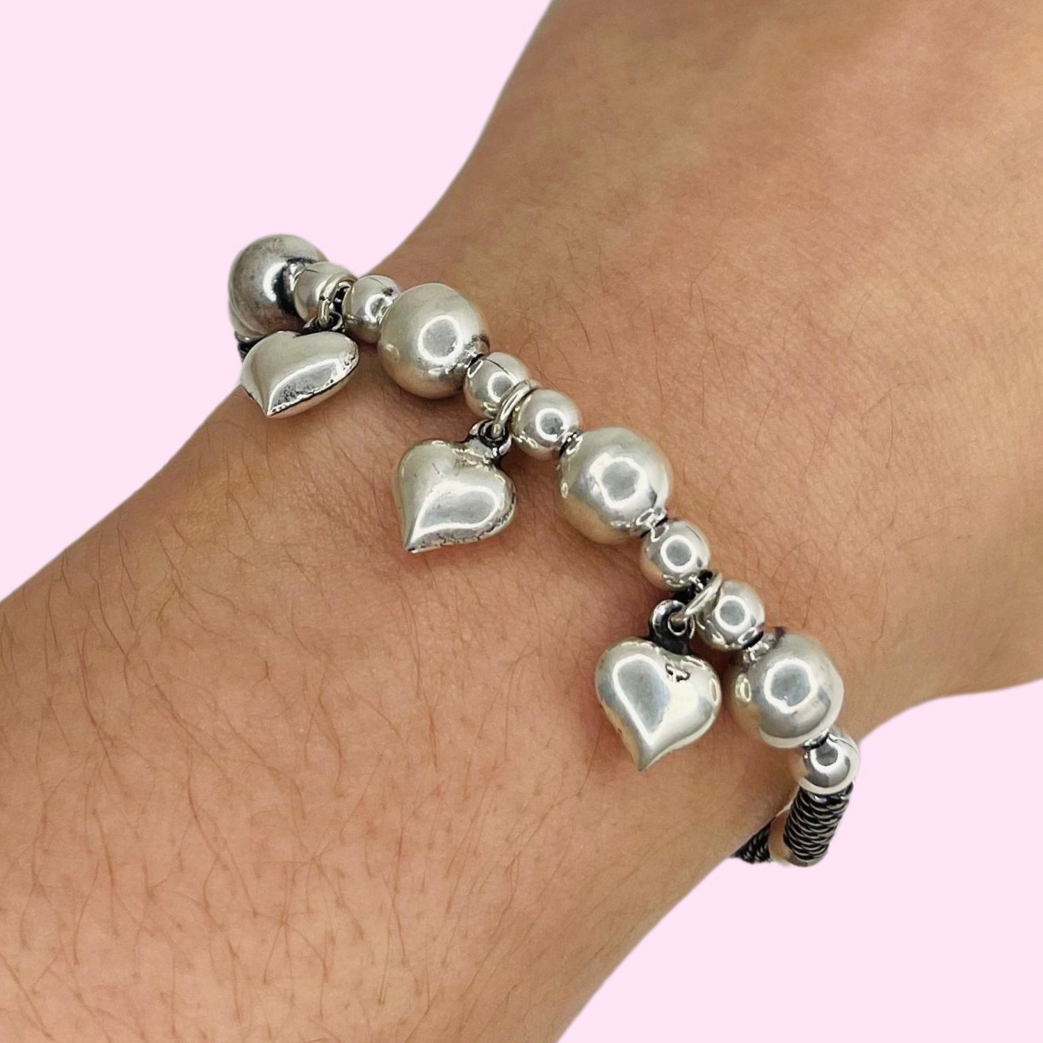 Pulsera bali bolitas y corazones de plata