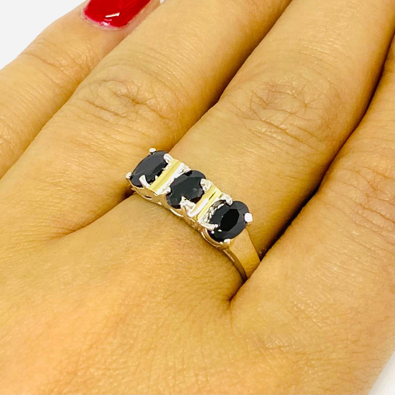 Anillo Trio con cubic Ovalado Negro Plata y Oro