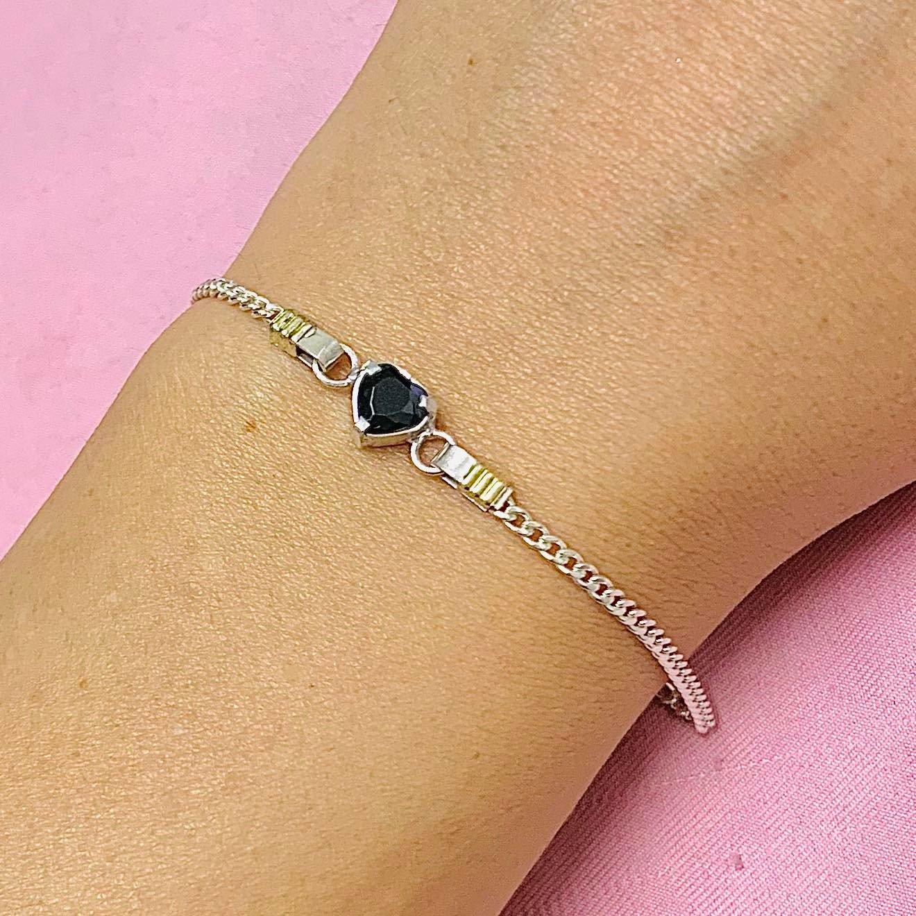 Pulsera groumet con Corazon Negro 6mm de Plata y Oro
