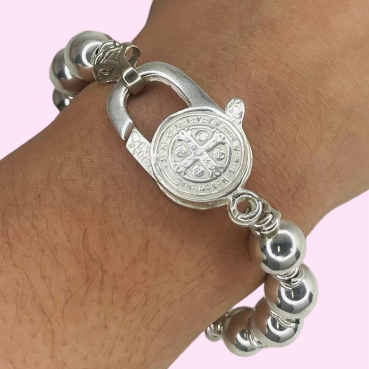 Pulsera Bolitas 10mm con San Benito Plata 925