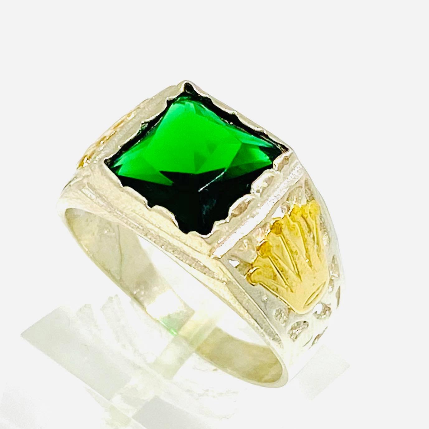 Anillo para Hombre con Corona piedra esmeralda Plata y Oro