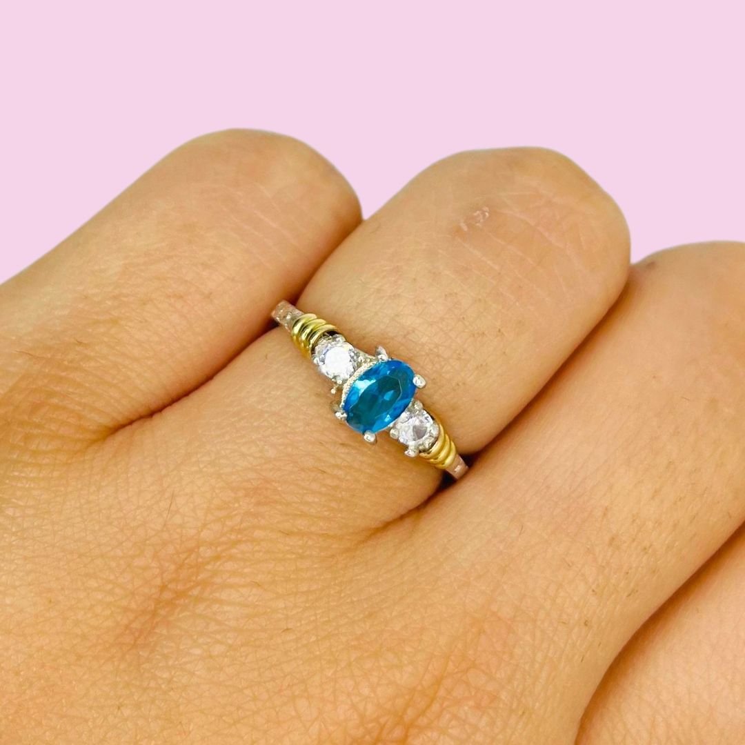 Anillo Compromiso con tres cubic Aguamarina-Blanco
