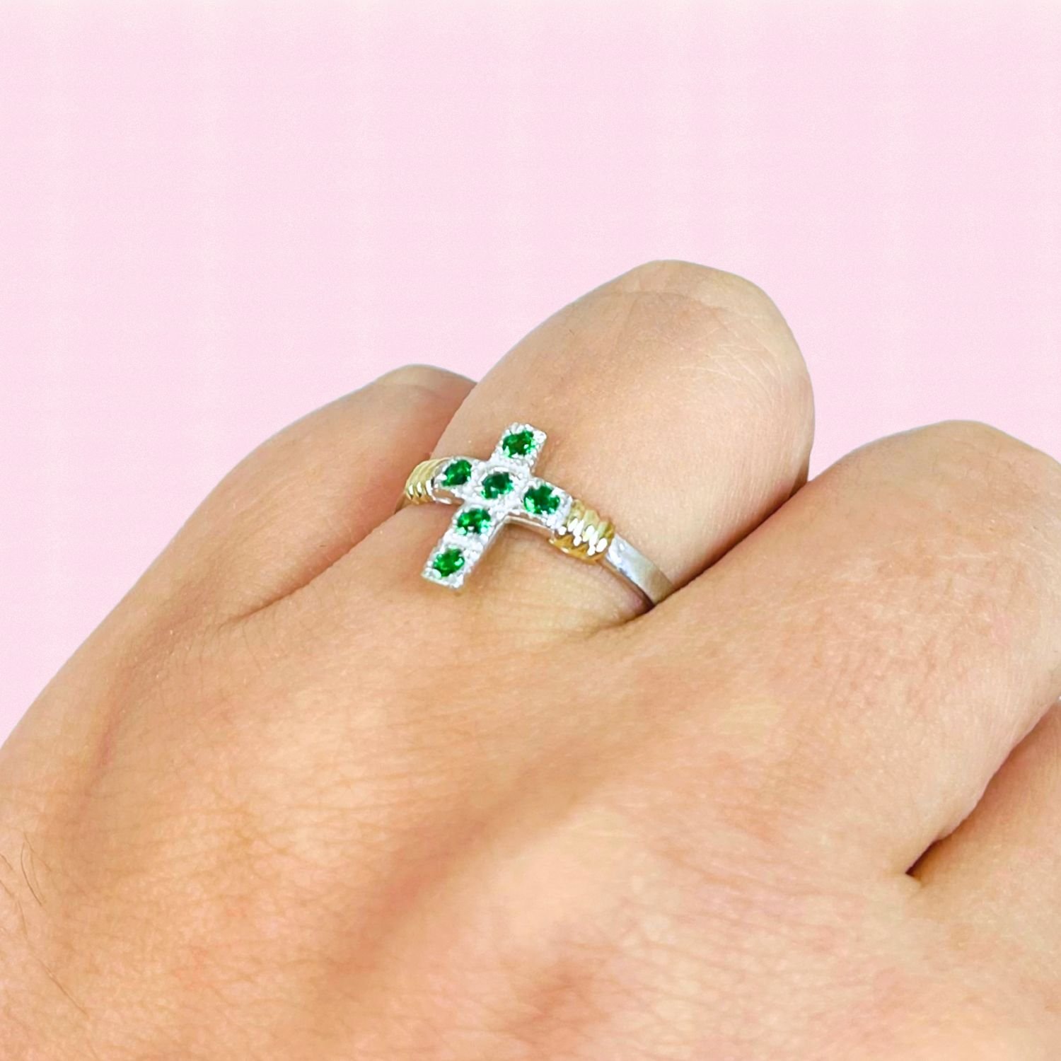 Anillo Cruz Con cubic Esmeralda Plata 925 y Oro 18k