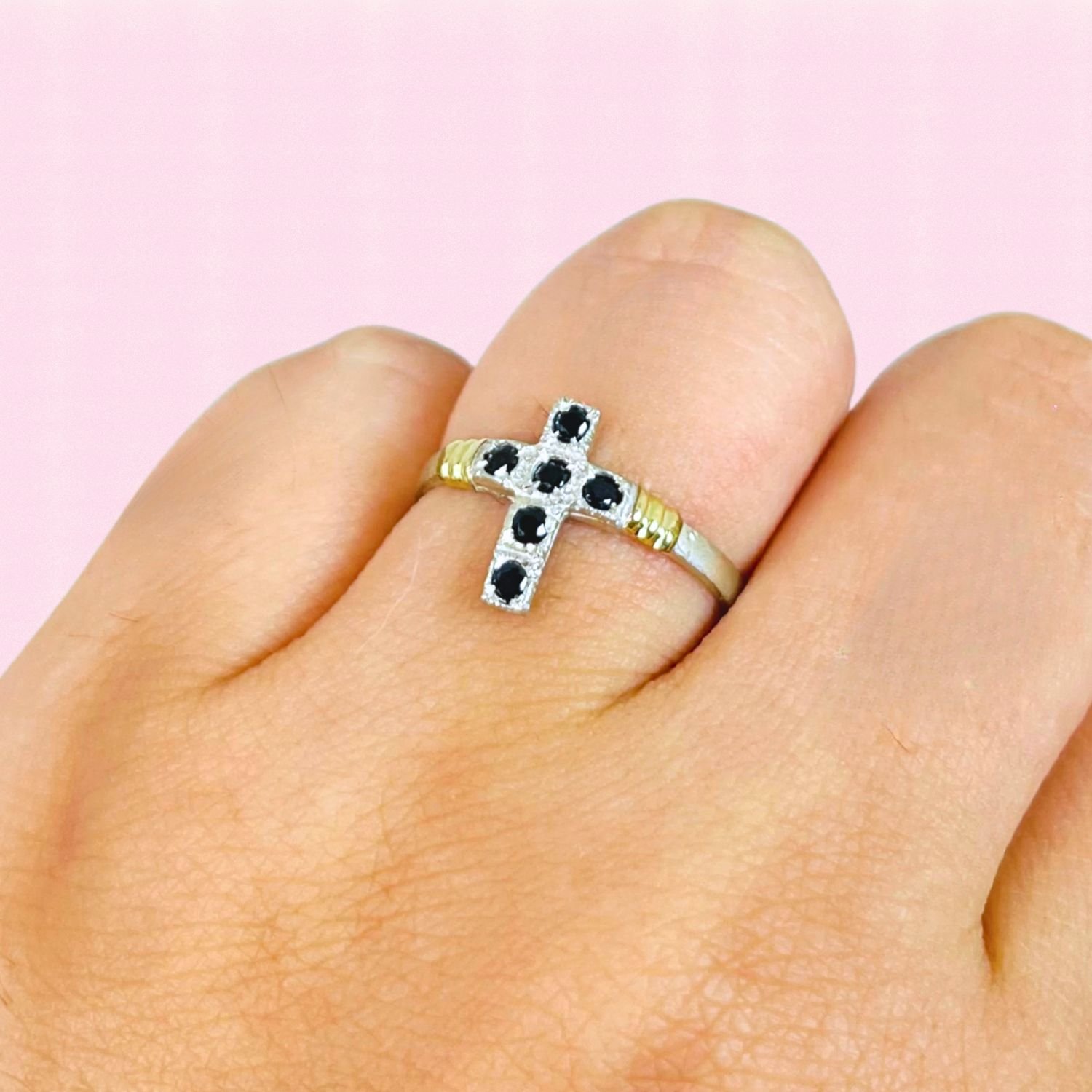 Anillo Cruz Con cubic Negro Plata 925 y Oro 18k