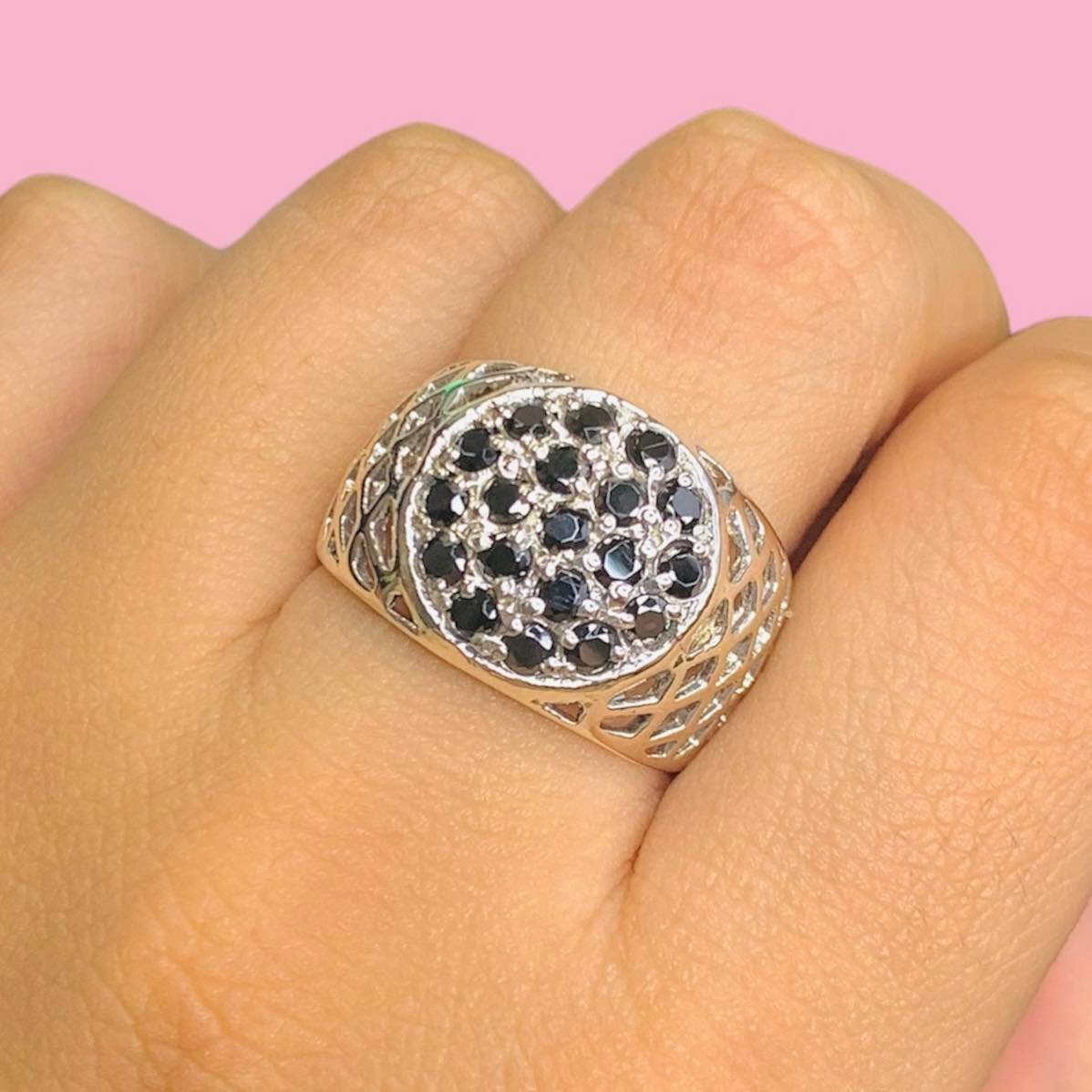 Anillo frutillon sello tejido con cubic Negro