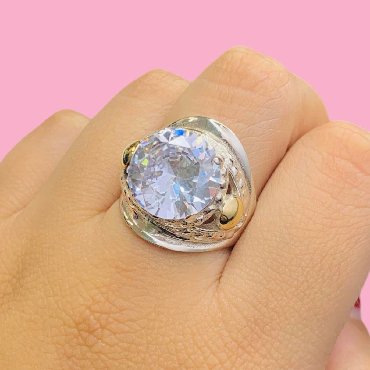 Anillo Importante con cubic Blanco de 15mm de Plata y Oro