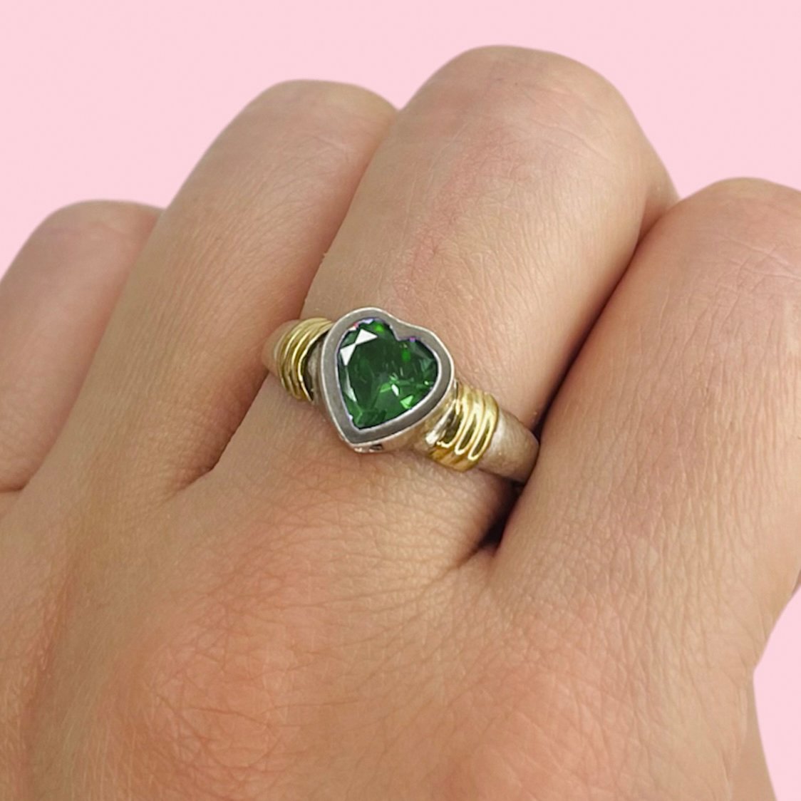 Anillo Corazon 10mm Esmeralda Plata y Oro