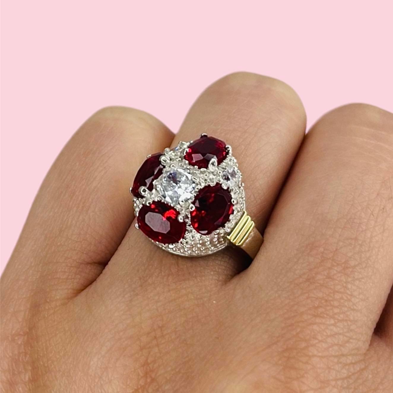 Anillo Frutillon Gota Combinado Rubi -Blanco Plata y Oro