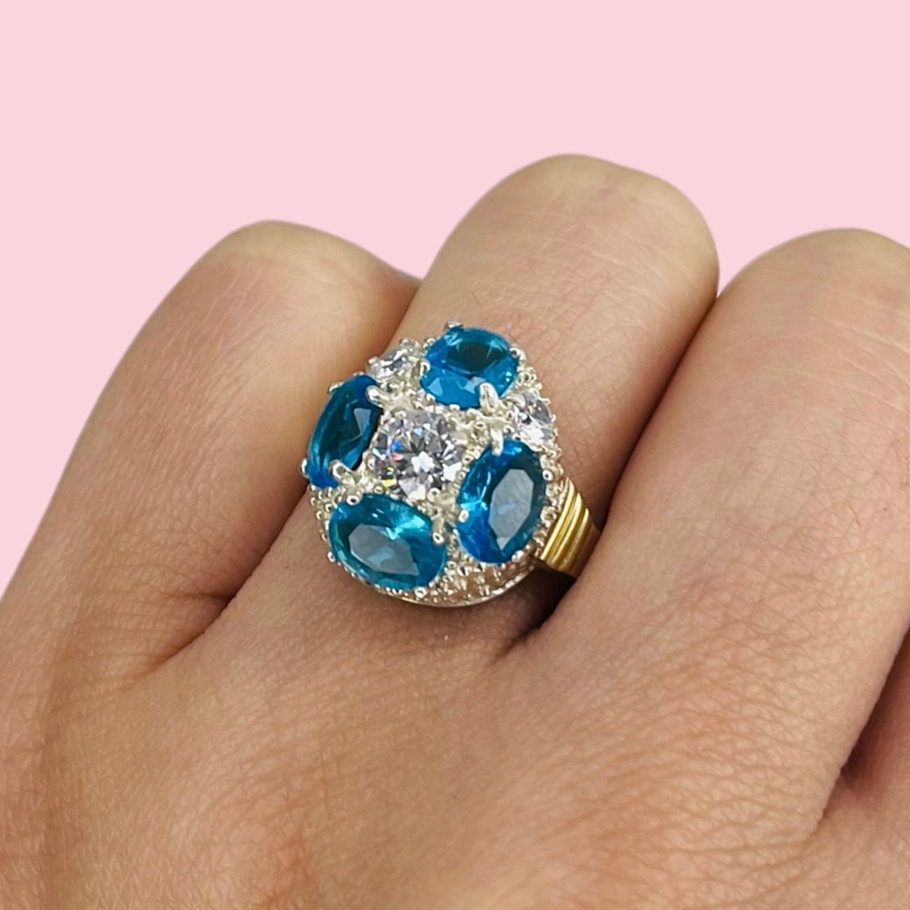 Anillo Frutillon Gota Combinado Aguamarina - Blanco Plata y Oro