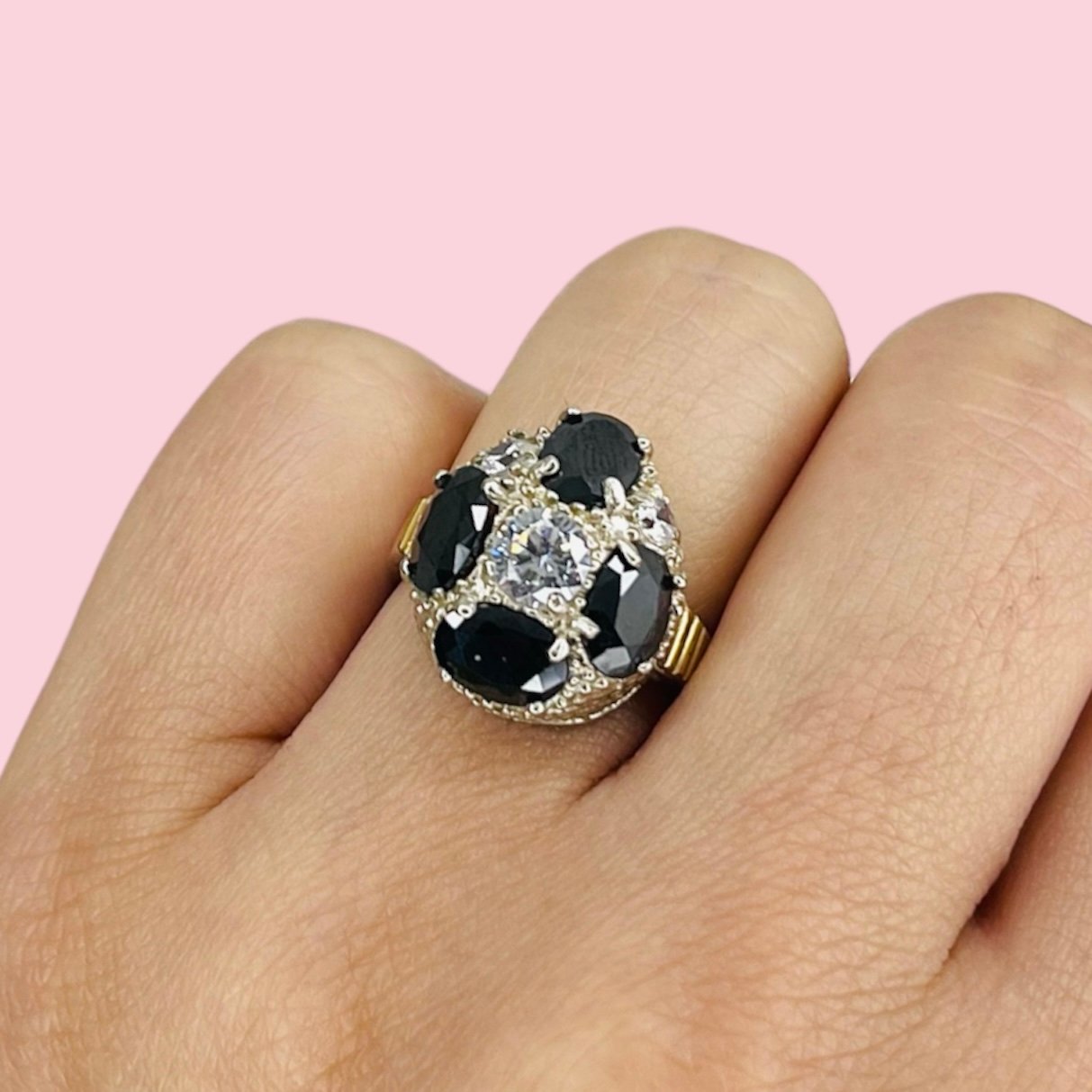 Anillo Frutillon Gota Combinado negro- Blanco Plata y Oro