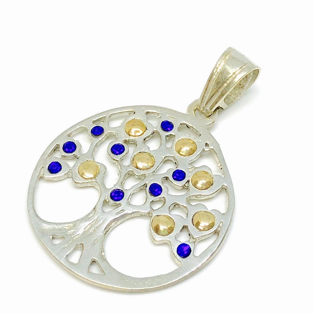 Dije arbol de la vida con piedras color Azul Electrico 40mm Plata y oro