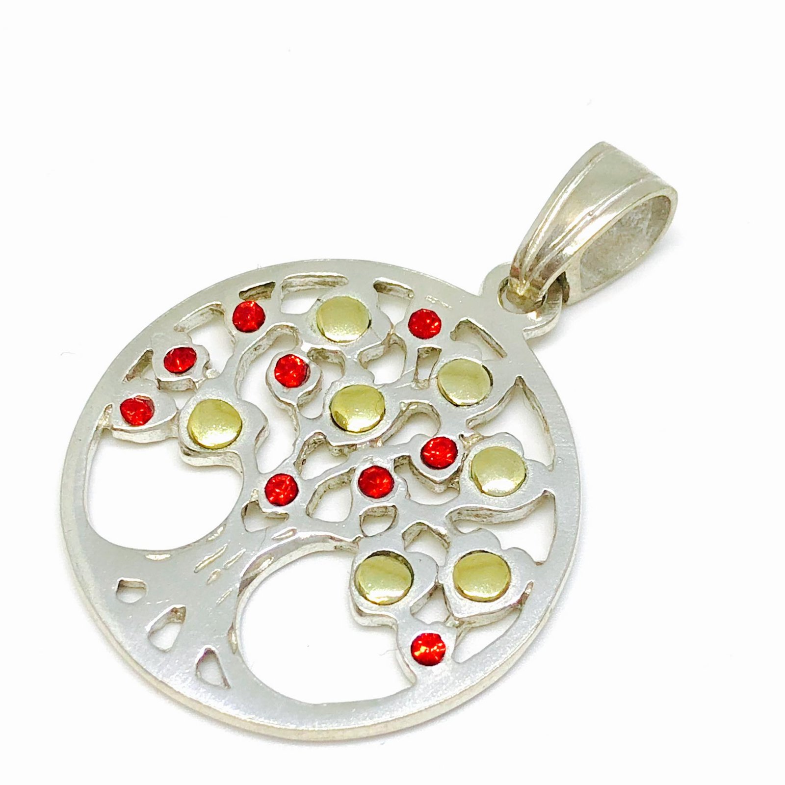 Dije arbol de la vida con piedras color Rubi 40mm Plata y Oro