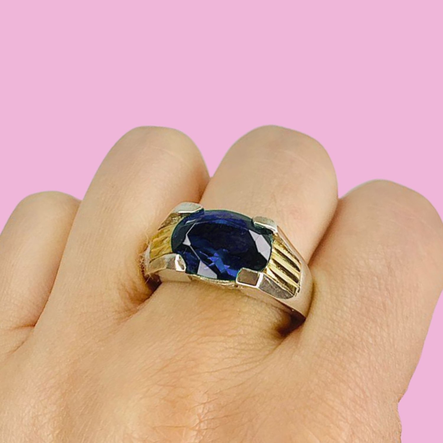 Anillo Grande con Cubic Ovalado 14mm x 10mm Zafiro para Hombre Plata y Oro