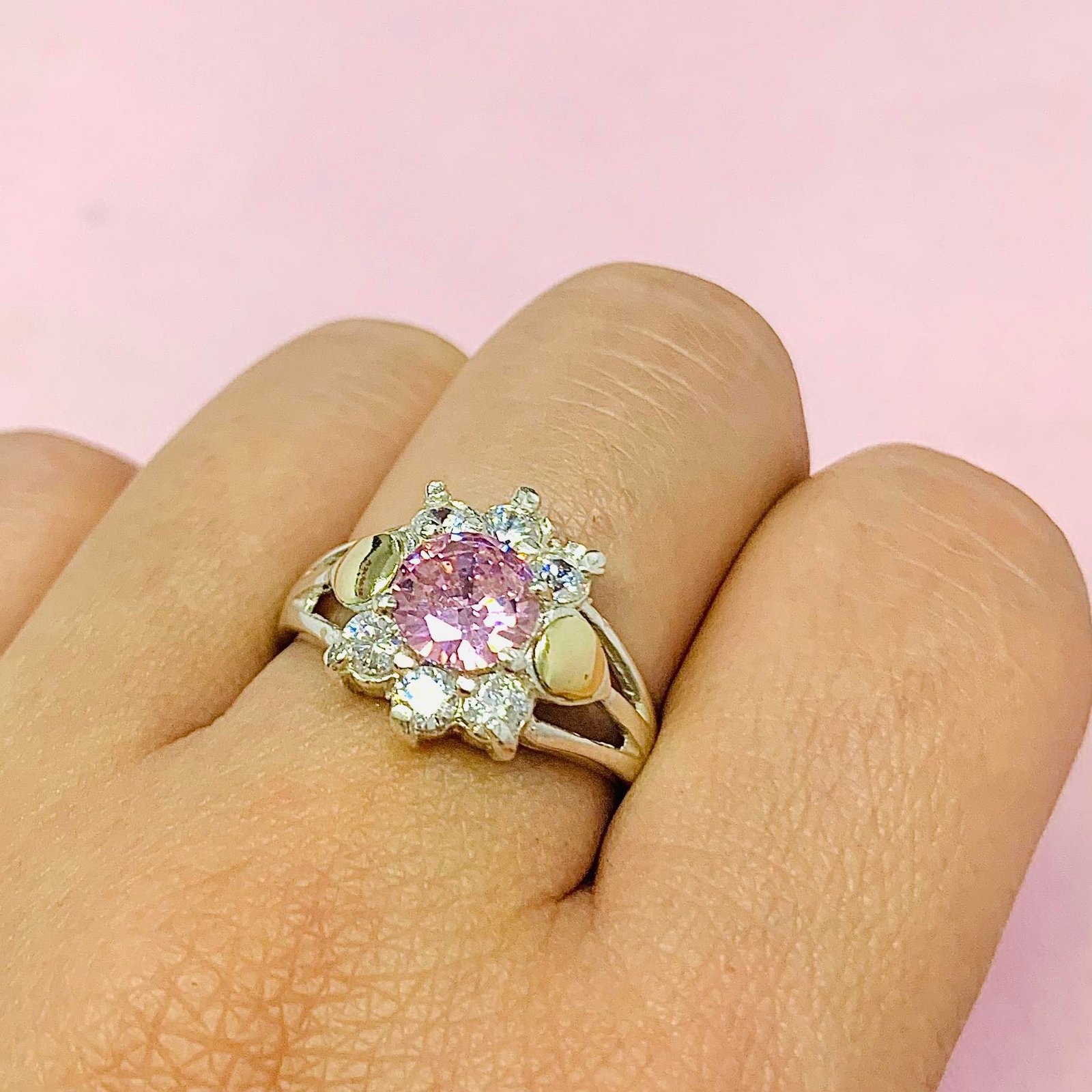 Anillo roseta Rosa con Blanco de Plata y Oro
