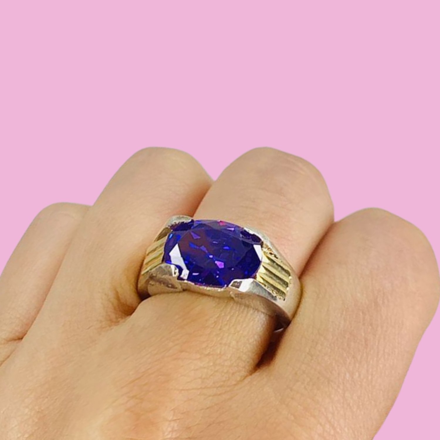 Anillo Grande con Cubic Ovalado 14mm x 10mm Amatista para Hombre Plata y Oro
