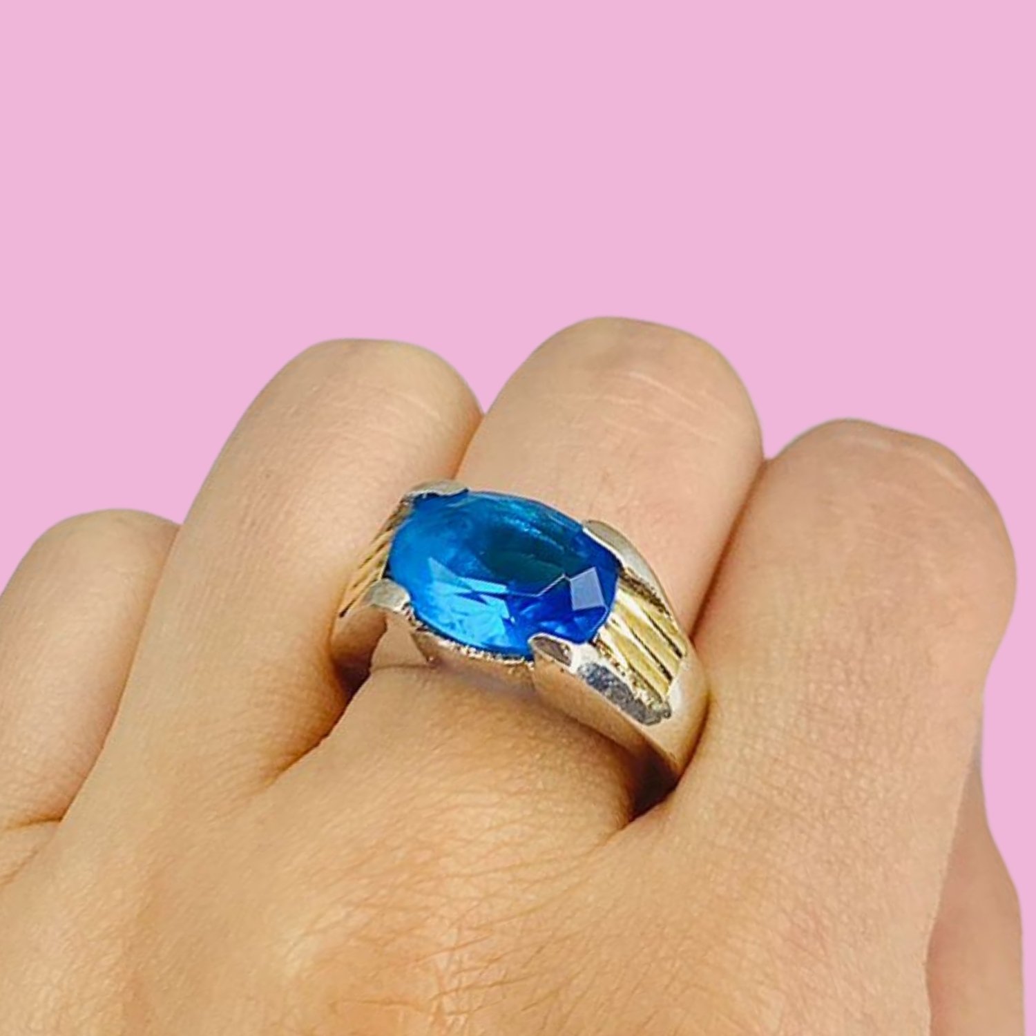 Anillo Grande con Cubic Ovalado 14mm x 10mm Aguamarina para Hombre Plata y Oro