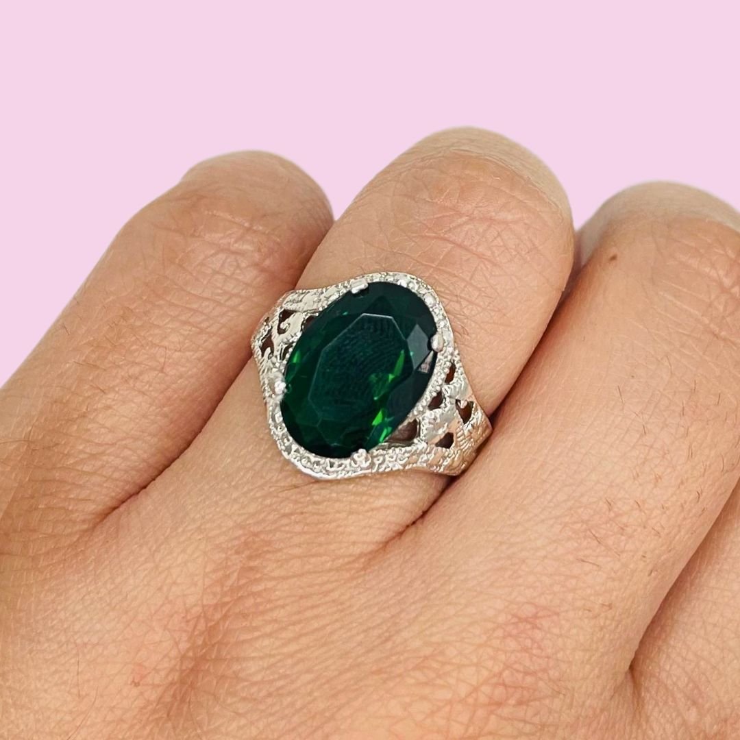 Anillo con Cubic Ovalado Grande Esmeralda de Plata 925
