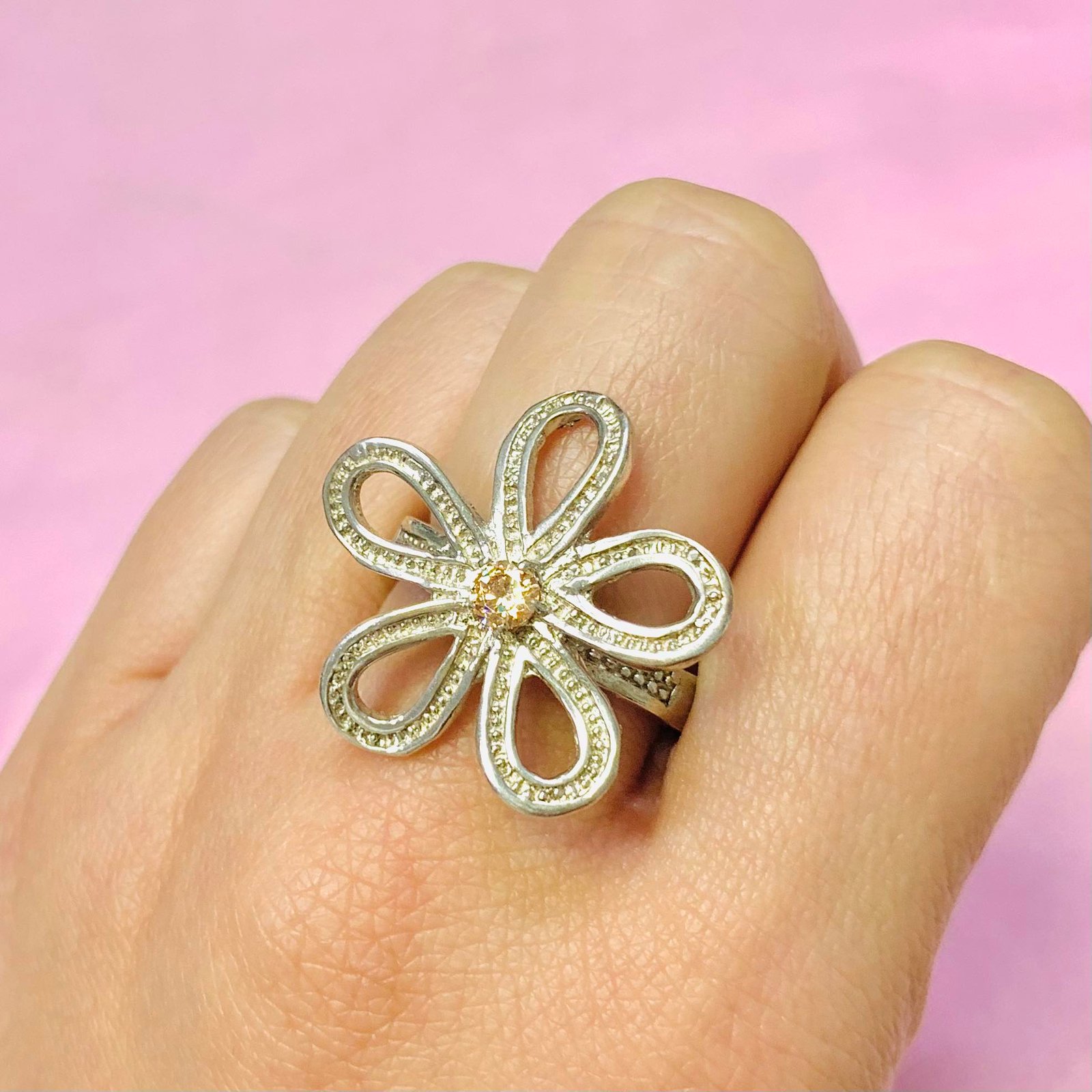 Anillo Flor Grande Ambar 4mm Plata y Oro