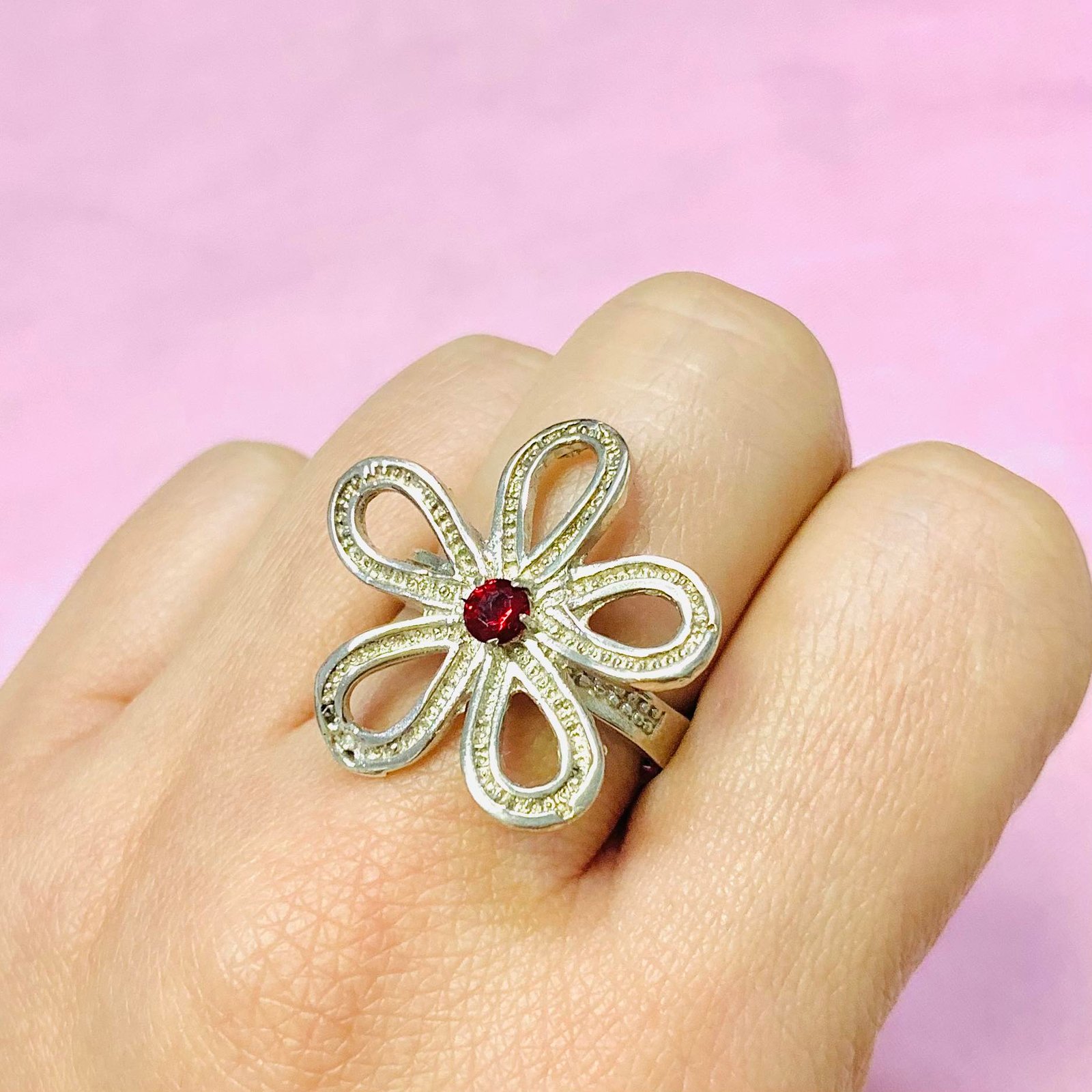 Anillo Flor Grande Rubi 4mm Plata y Oro