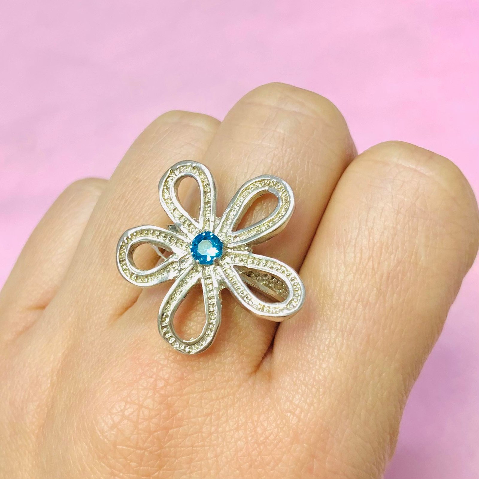 Anillo Flor Grande Agua Marina 4mm Plata y Oro