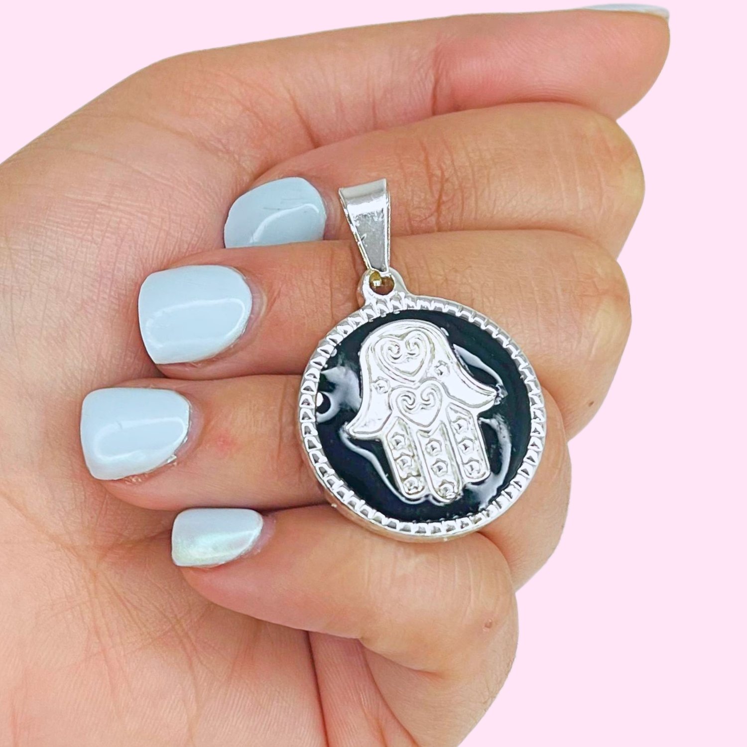 Dije Mano De Fatima Esmaltado 37mm Acero Blanco