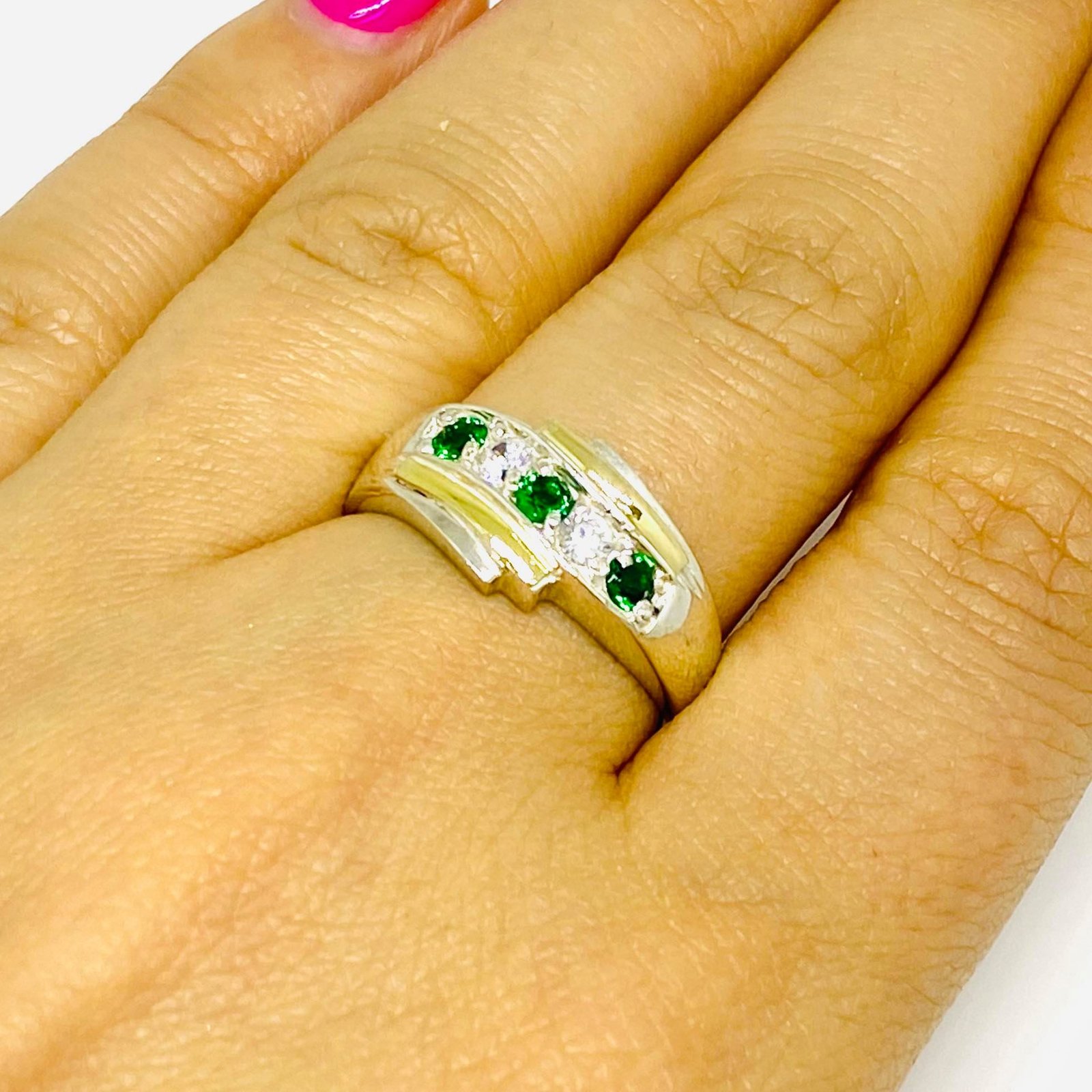 Anillo Caminos con Cubic Blanco-Esmeralda Plata y Oro