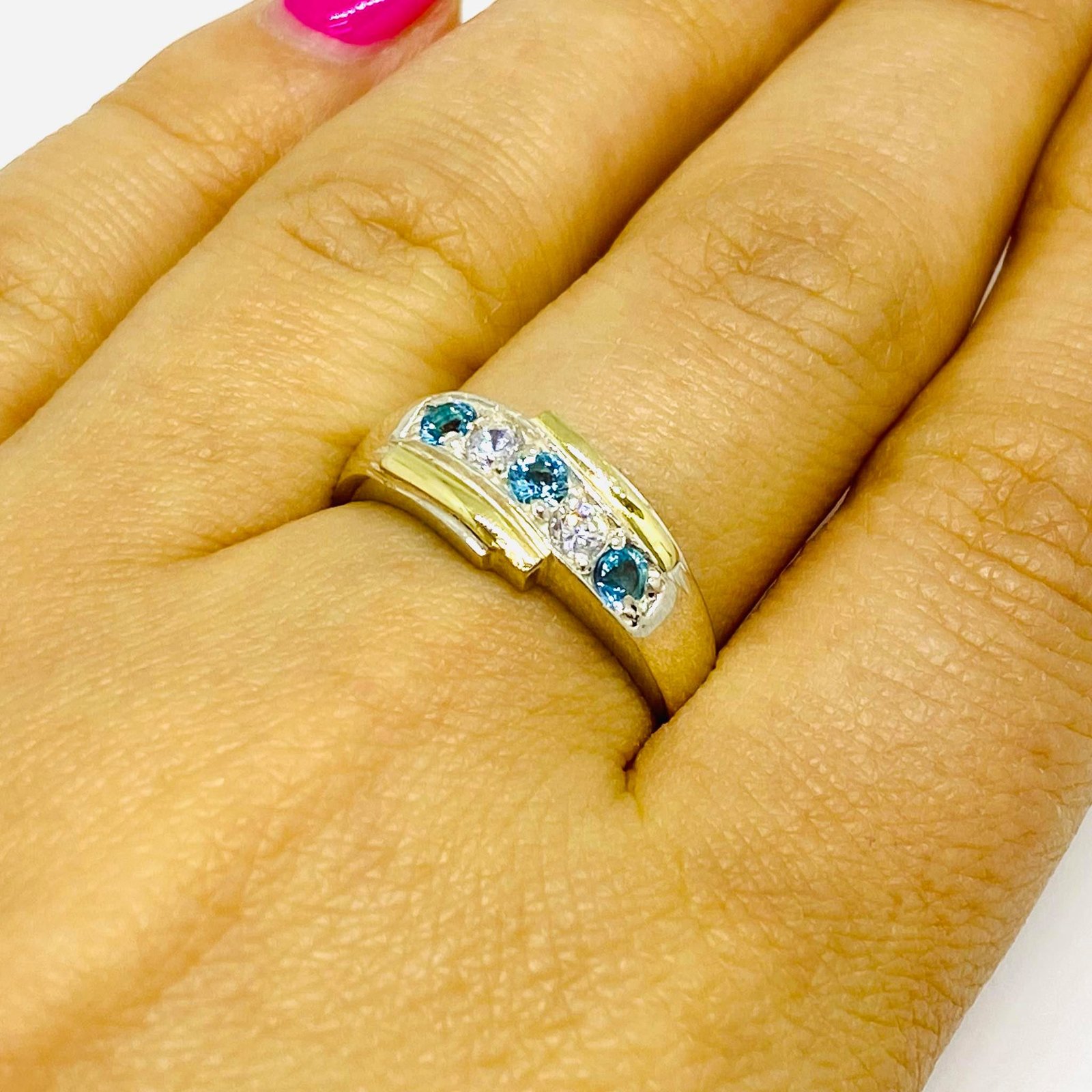 Anillo Caminos con Cubic Blanco-Aguamarina Plata y Oro