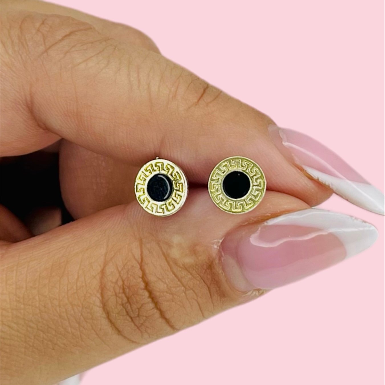 Aritos Guarda Griega Mediano 9mm con Onix Plata y Oro