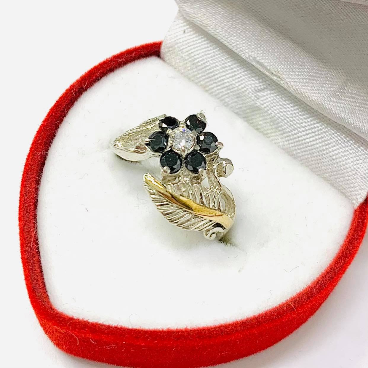 anillo flor con hoja cubic negro de plata y oro