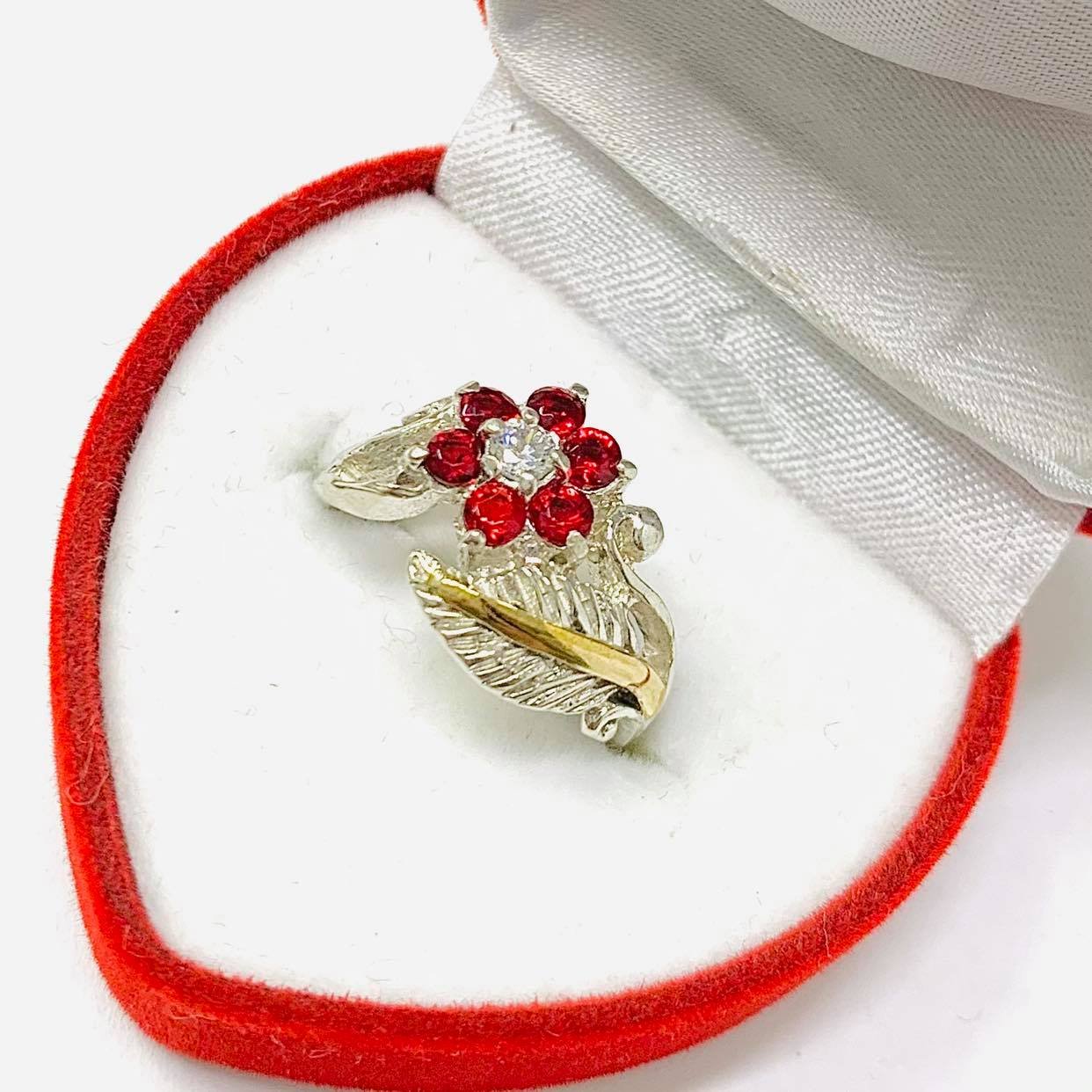 anillo flor con hoja cubic rubi de plata y oro