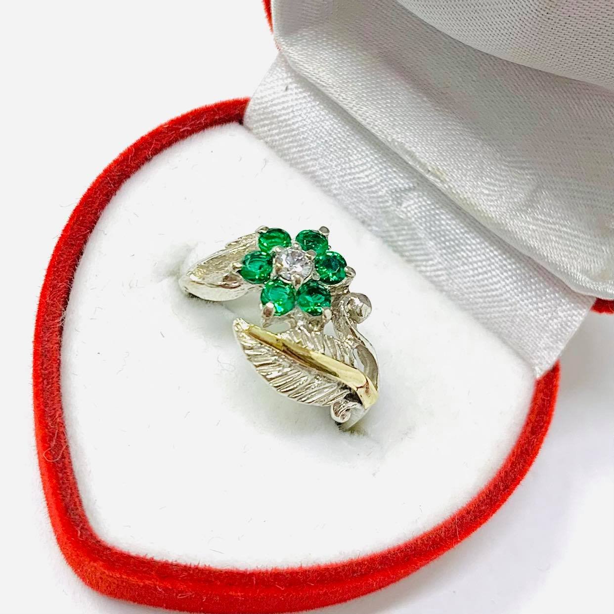 anillo flor con hoja cubic esmeralda de plata y oro