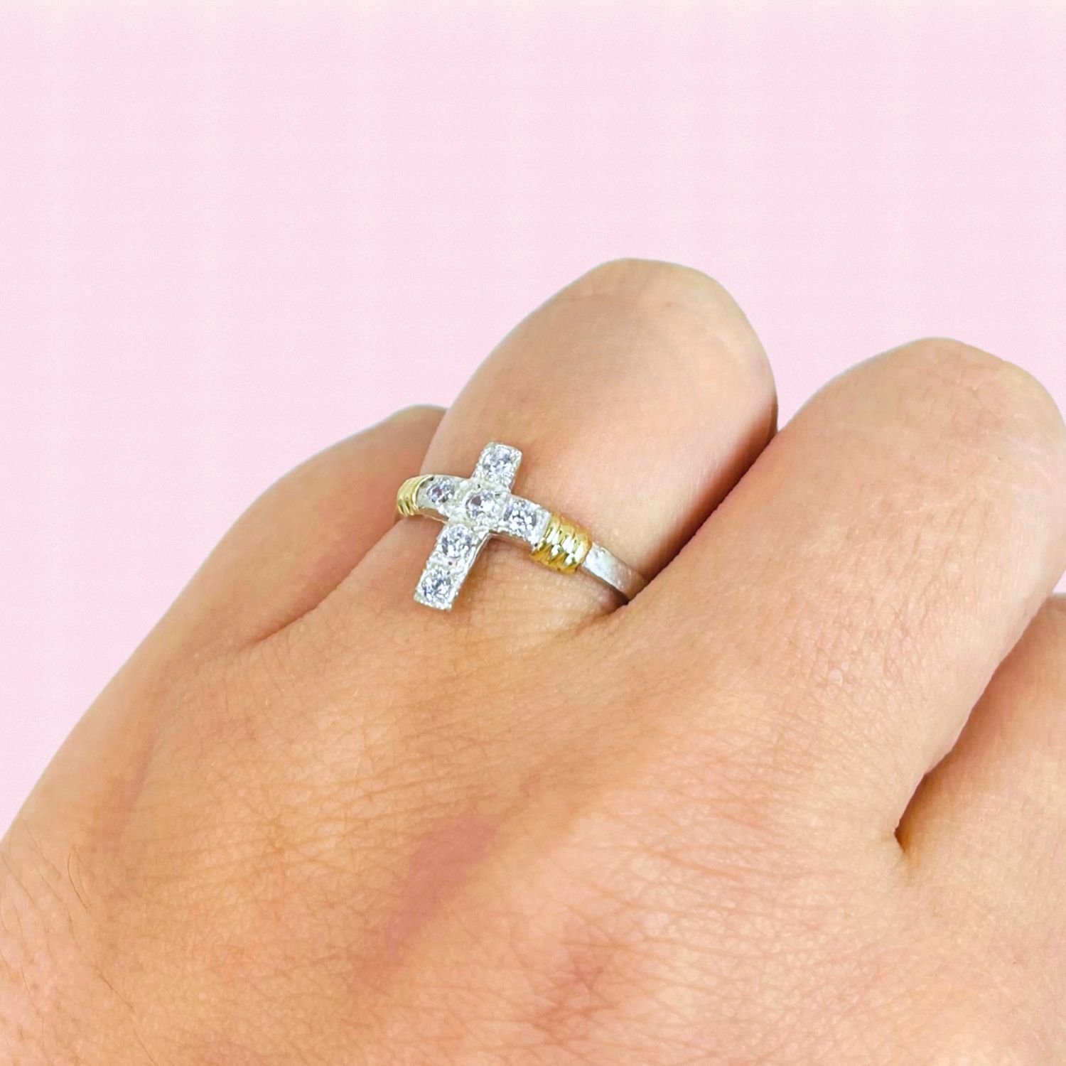 Anillo Cruz Con cubics Blanco Plata 925 y Oro 18k