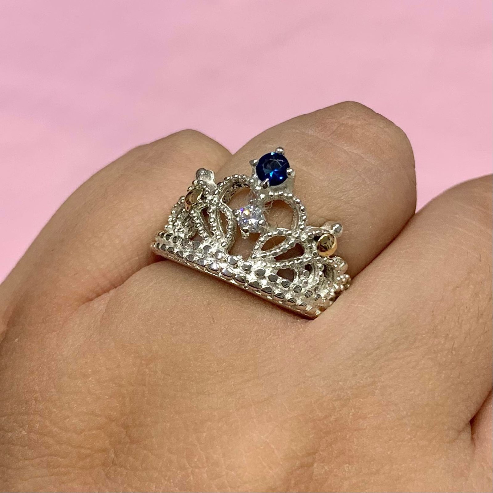 Anillo corona con cubic zafiro-blanco de Plata y Oro
