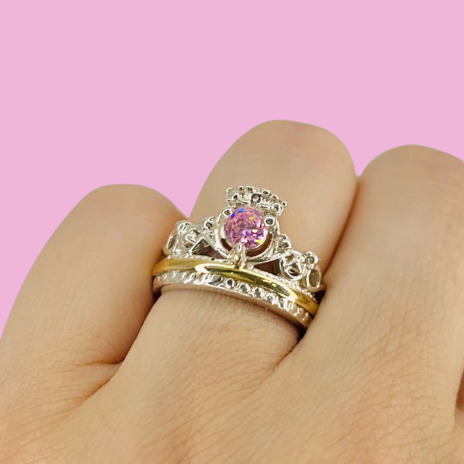 Anillo Corona con cubic redondo Rosa de Plata y Oro