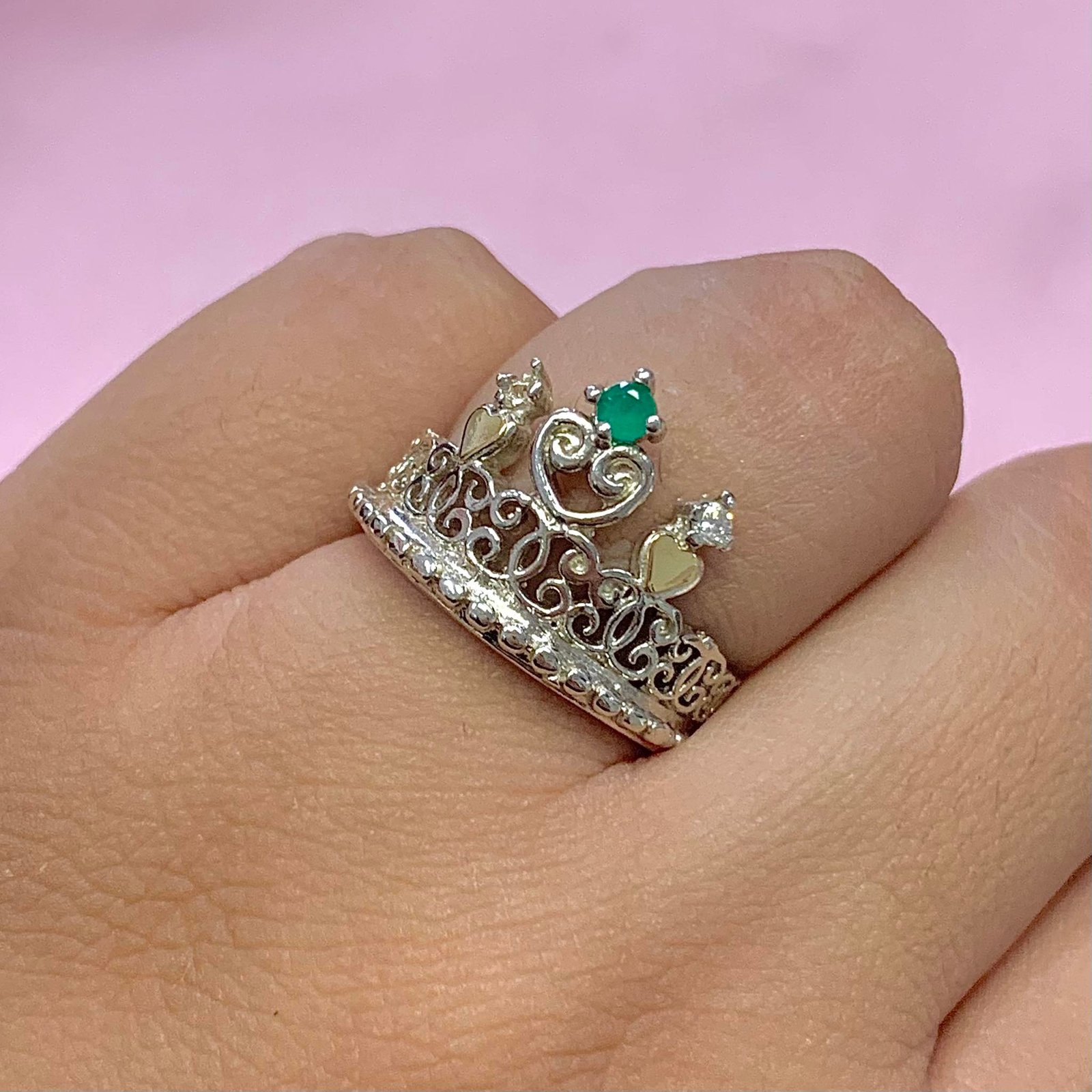 Anillo corona corazon con tres cubic Esmeralda-Blanco