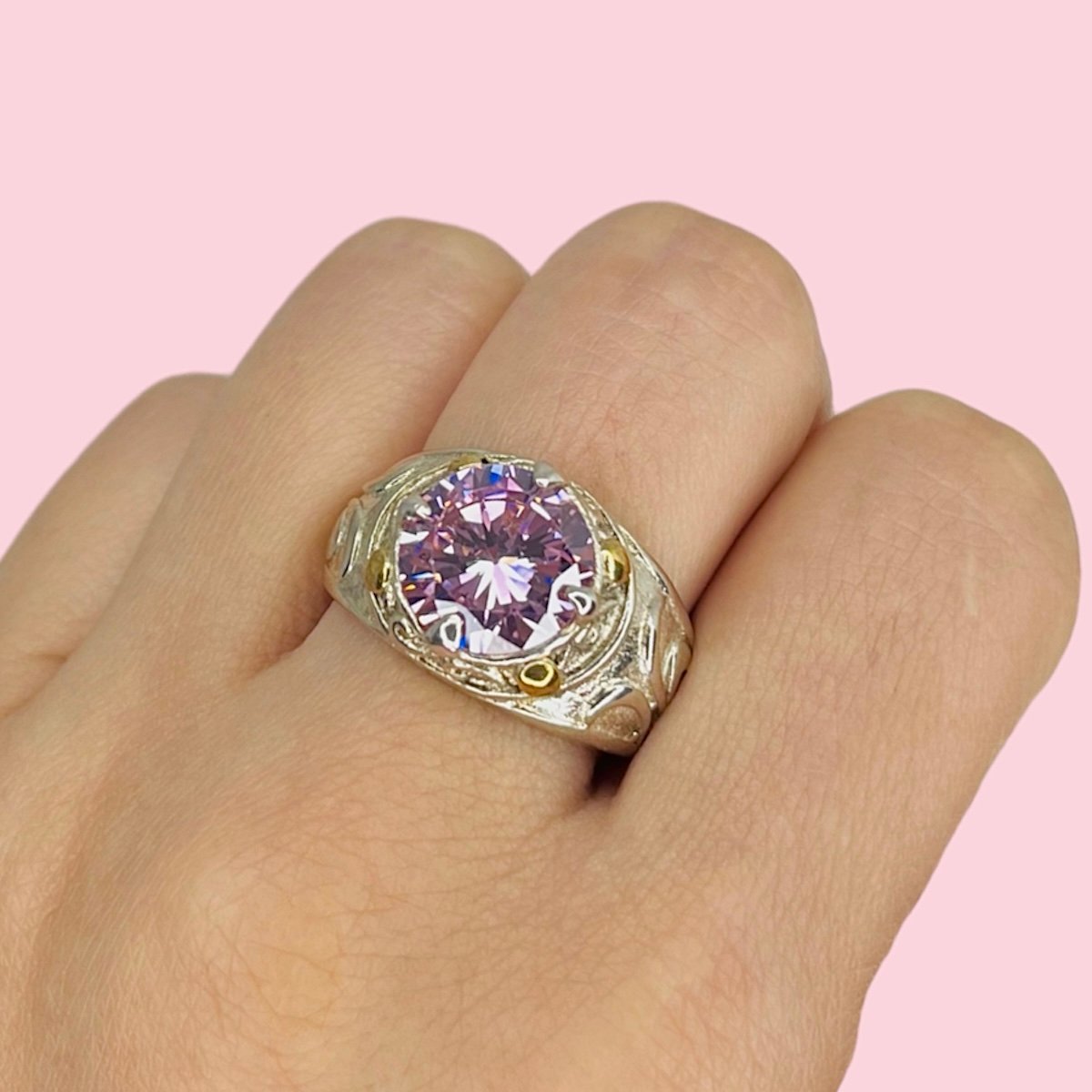 Anillo unisex grande con cubic rosa de Plata y Oro