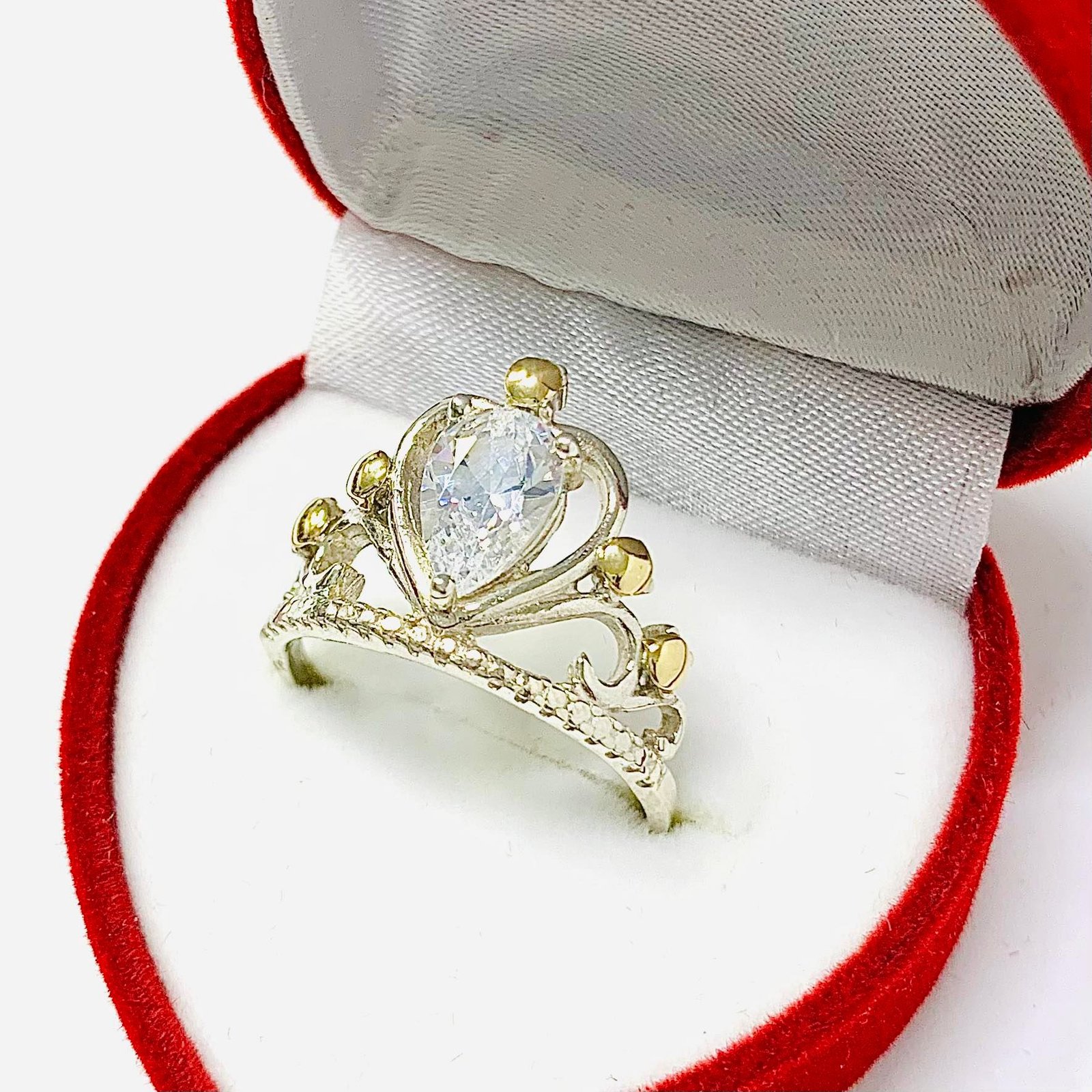 Anillo corona con gota blanco en corazon Plata y oro