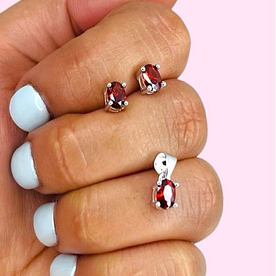 Conjunto Ovaladon Aritos con Dije 6mm x 4mm Rubi-Naranjado Plata 925