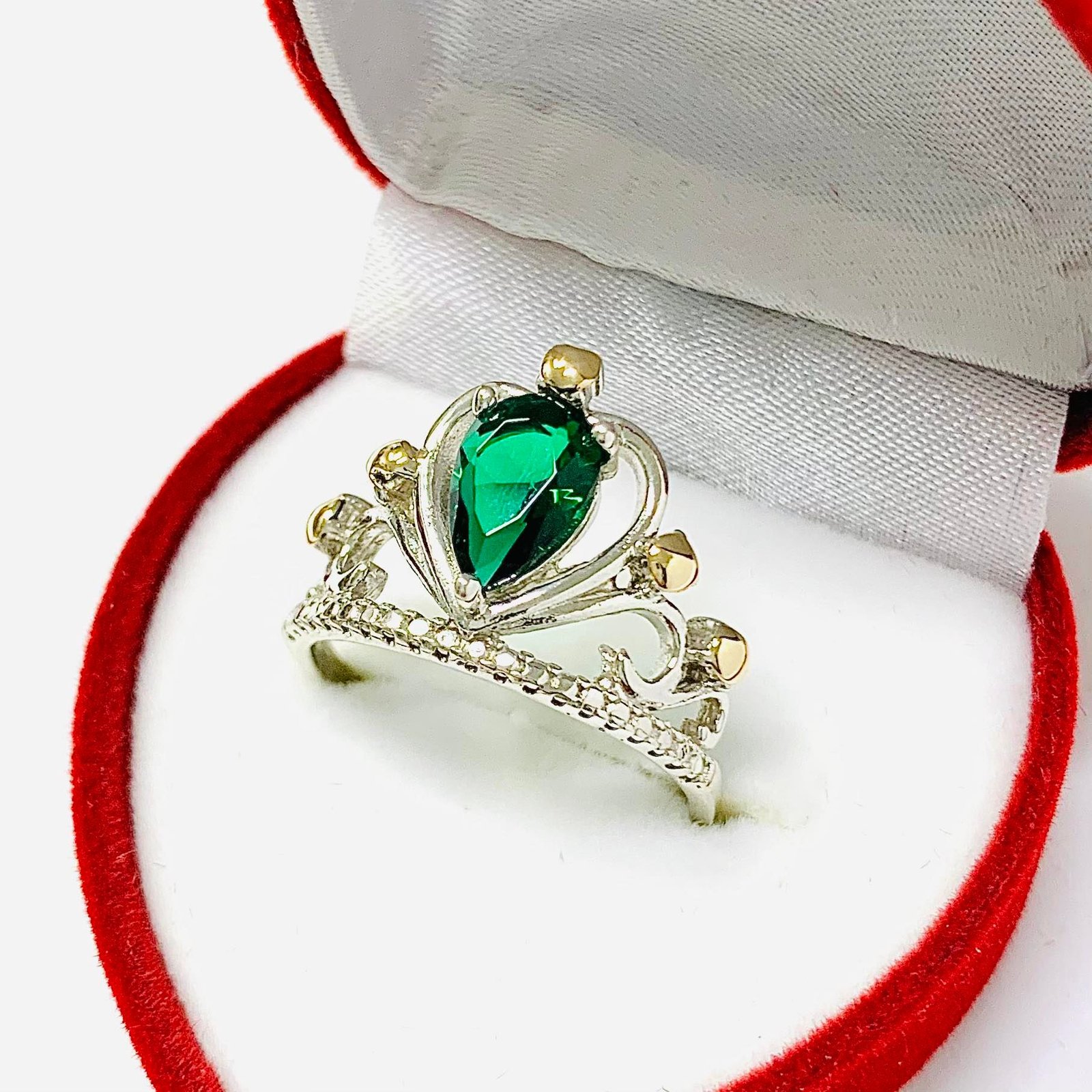 Anillo corona con gota esmeralda en corazon Plata y oro