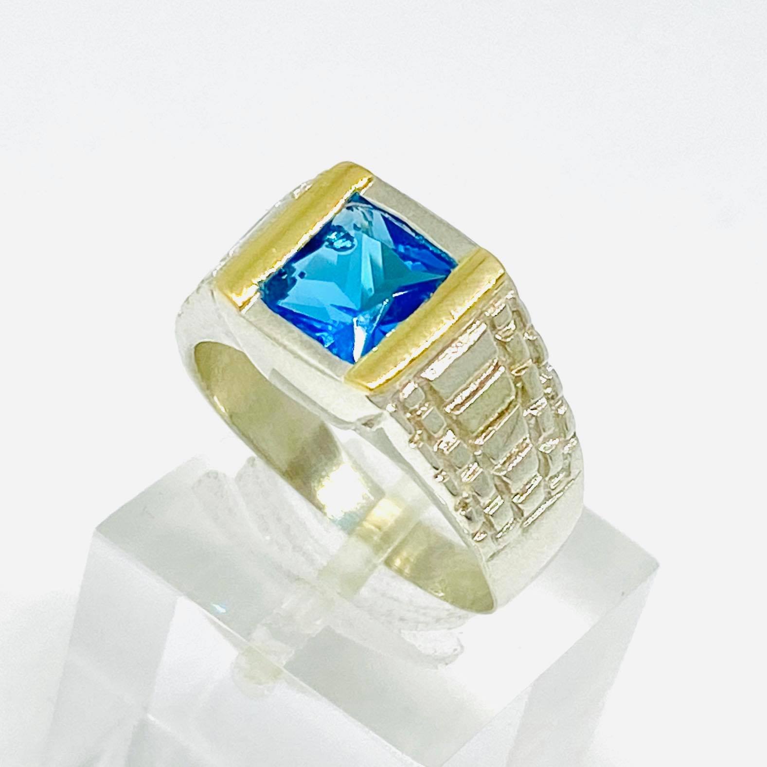 Anillo rollex con cubic cuadrado Aguamarina Plata y Oro
