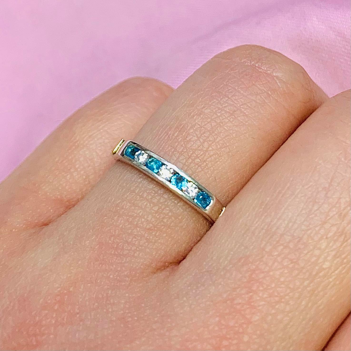 Anillo medio sinfin con piedras Blanco-Aguamarina de Plata y Oro