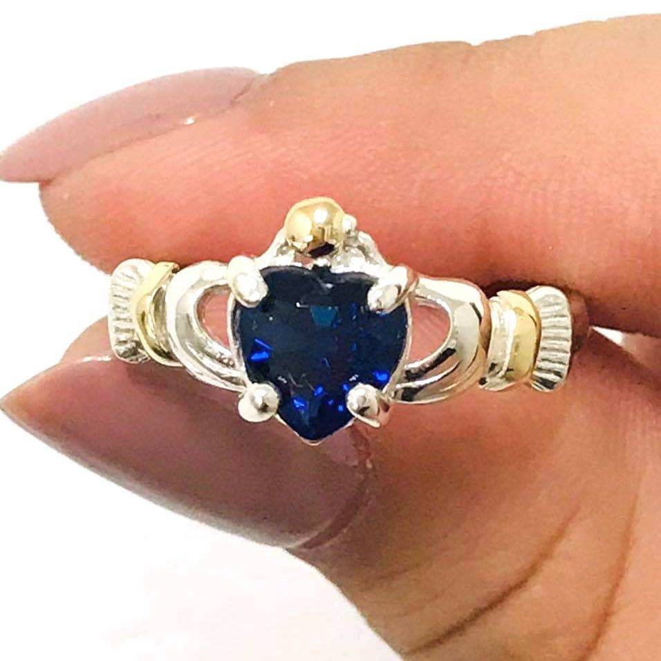 Anillo corazon en manos Zafiro Plata y Oro