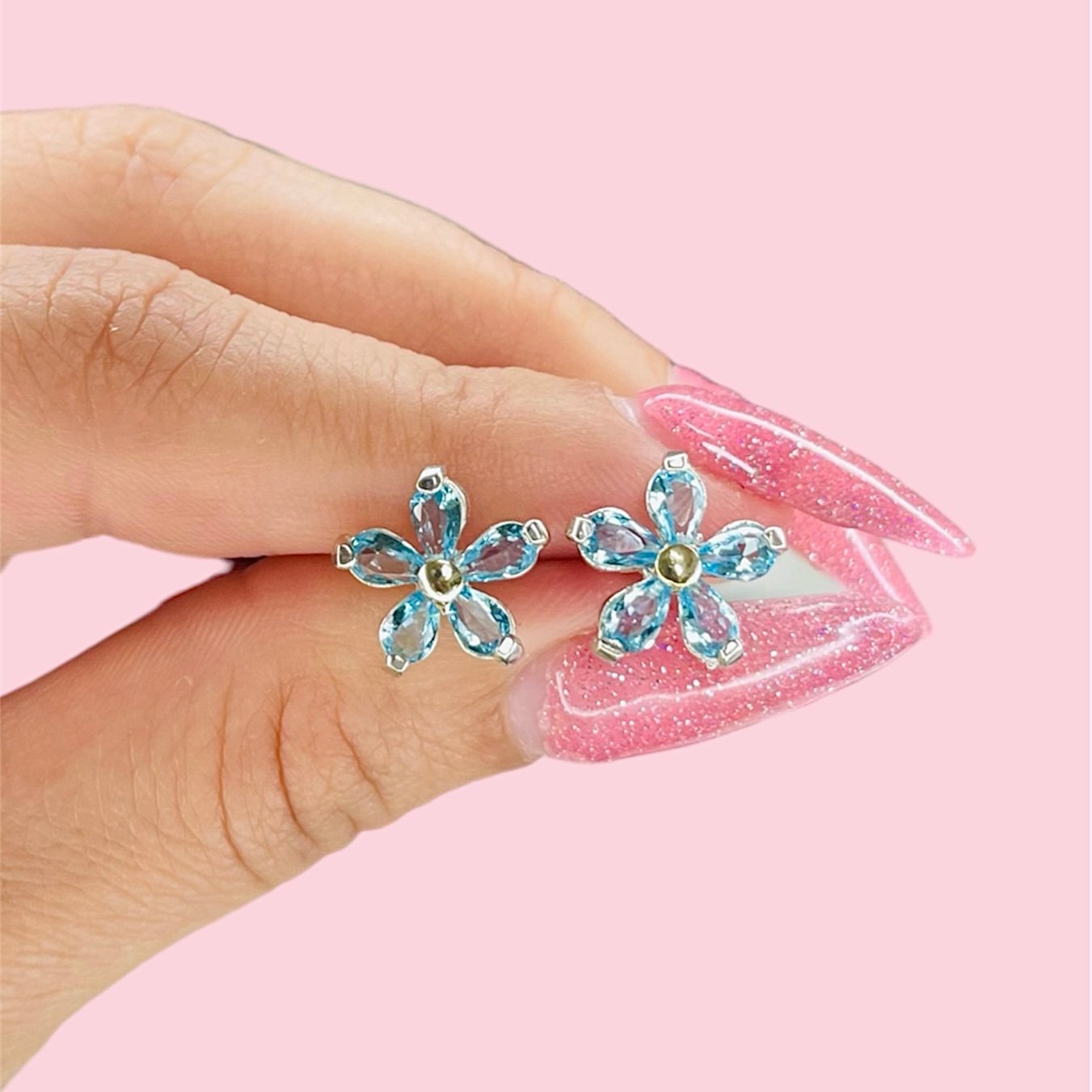 Aros flor Margarita con cubic Aguamarina Plata y Oro