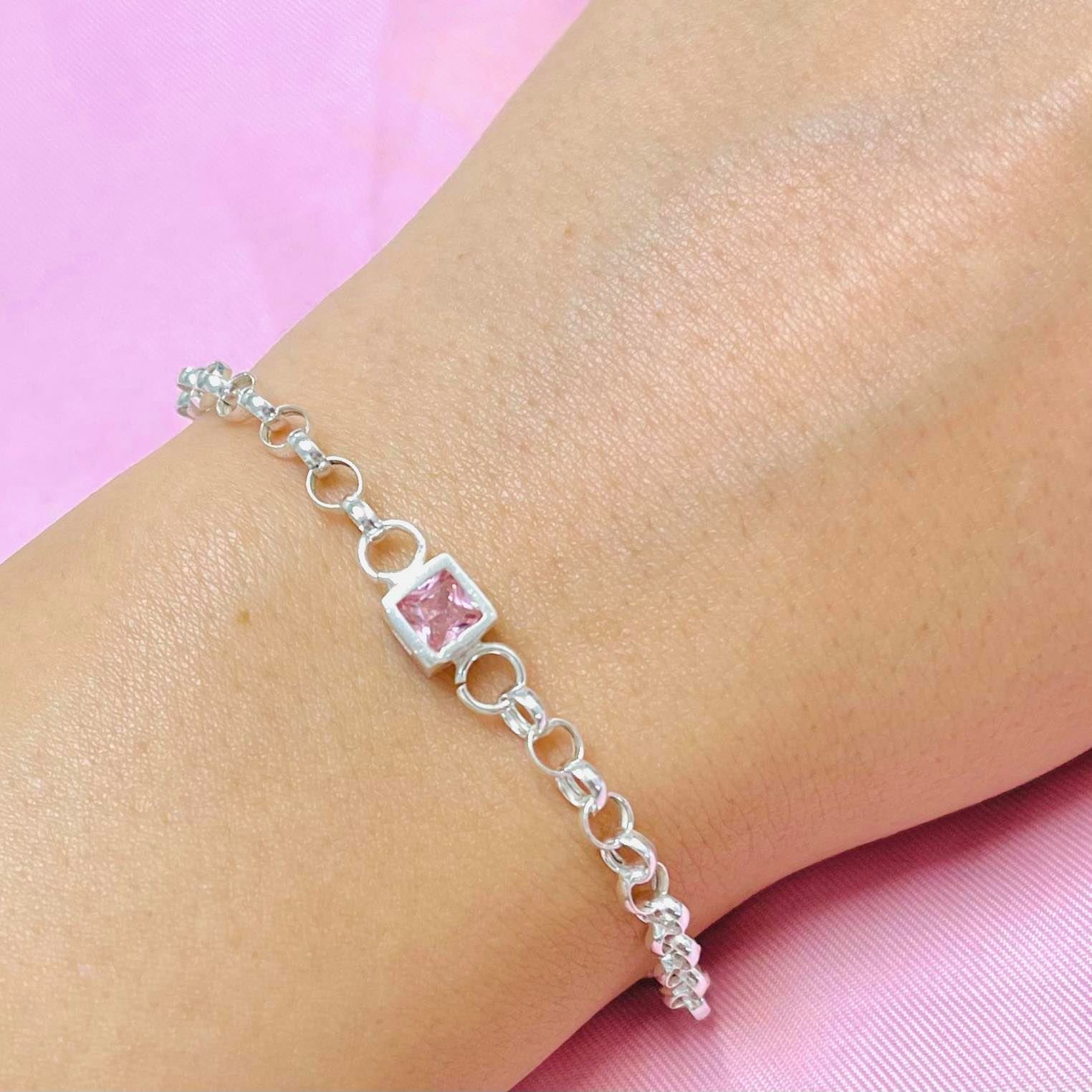 Pulsera con dije cuadrado chico Rosa plata 925