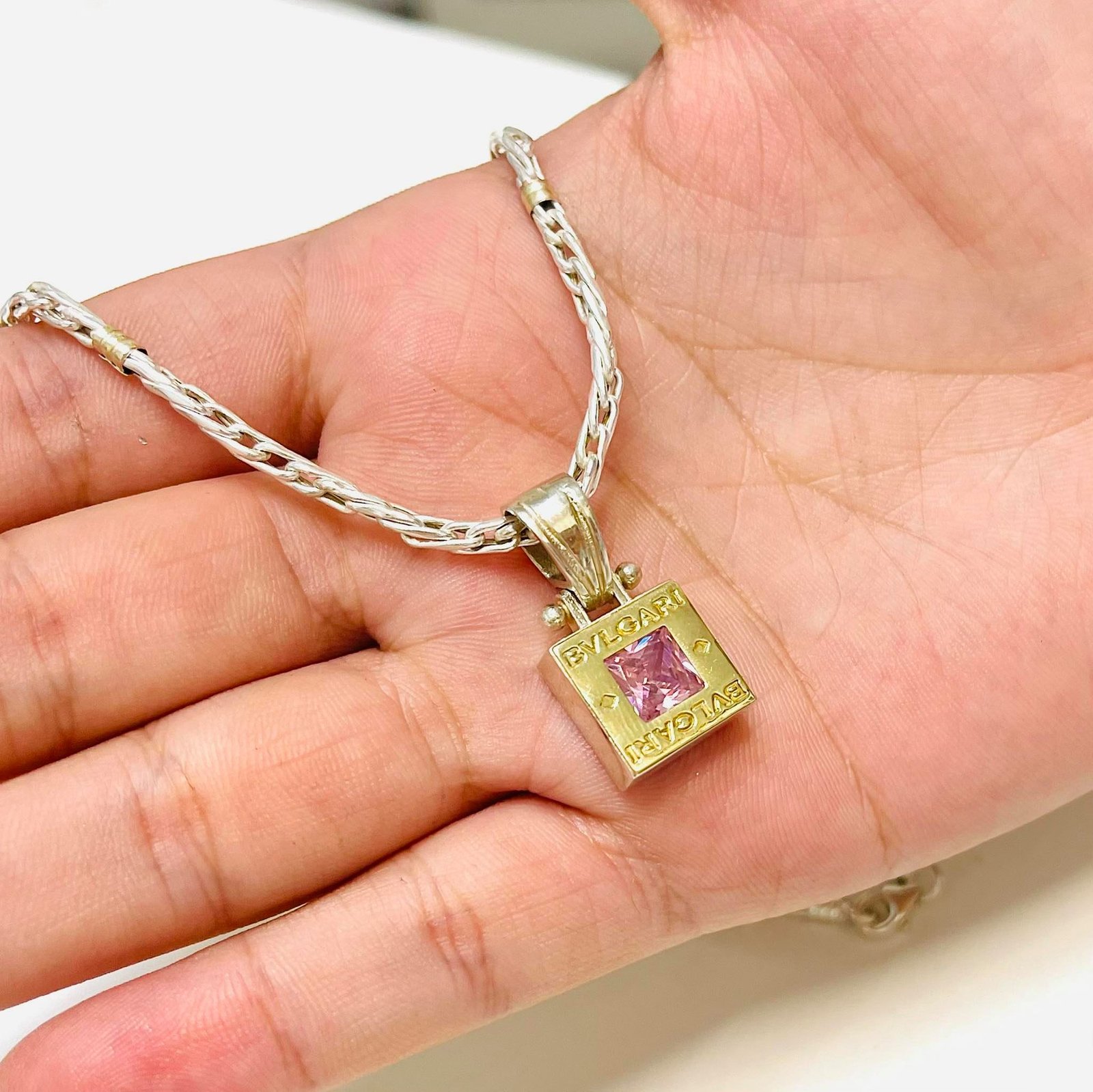 Cadena espiga con dije BVLG Rosa grande Plata y Oro